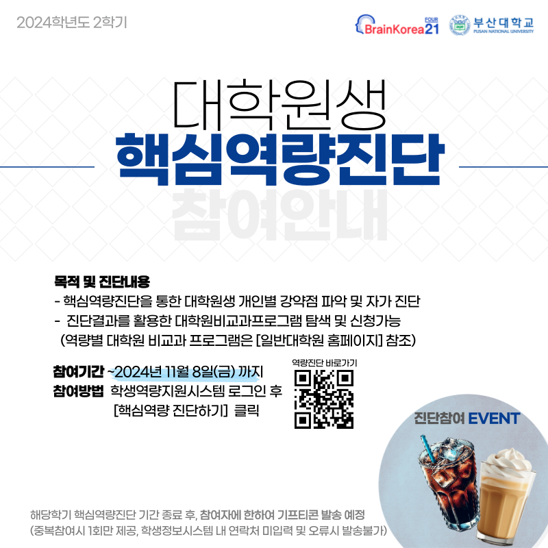 대학원생 핵심역량 진단을 통한 개인별 역량 파악 및 교육과정 개선을 위한 기초자료 확보 등을 위하여「대학원생 핵심역량 진단」을 실시하오니, 학생들이 참여할 수 있도록 적극 안내하여 주시기 바랍니다.