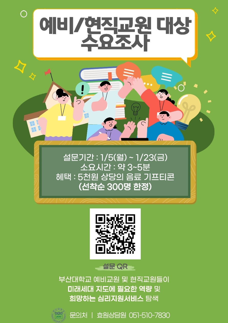 2) 목 적: 부산대학교의 예비 교원 및 현직 교원들이 미래세대를 지도하는데 필요한 역량 및 희망하는 심리지원서비스가 무엇인지 살펴보고자 함.