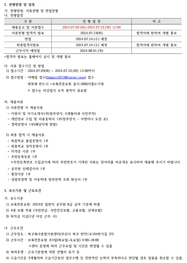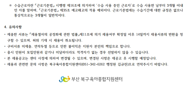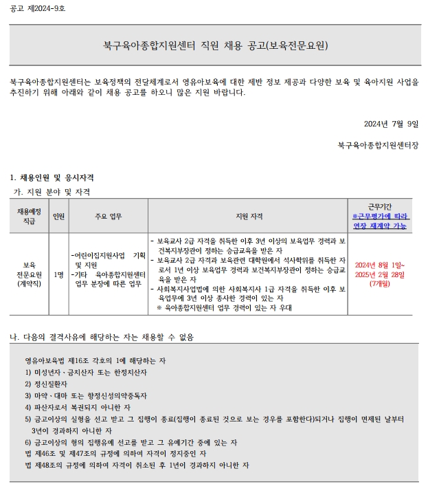 북구육아종합지원센터 직원 채용공고(보육전문요원) : 7/9(화)~7/23(화) 12:00