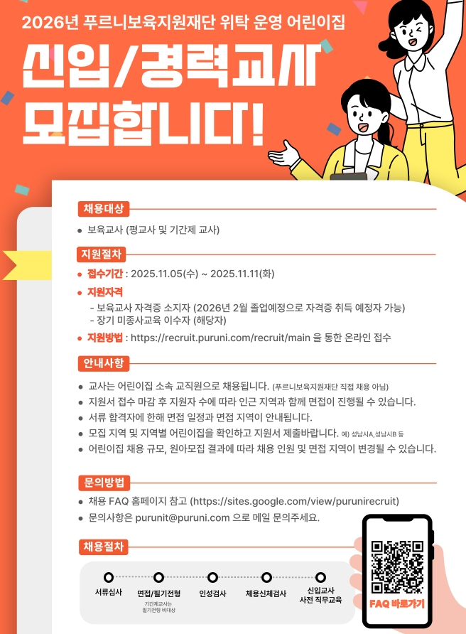 “푸르니보육지원재단 위탁 운영 어린이집” 2026년 상반기 정기 신입·경력 교사 채용: 11/5~11/11