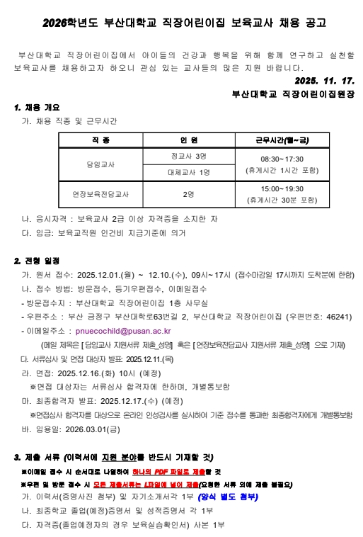 2026학년도 부산대학교 직장어린이집 보육교사 채용 공고 : 12/1(월)~12/10(수) 17시
