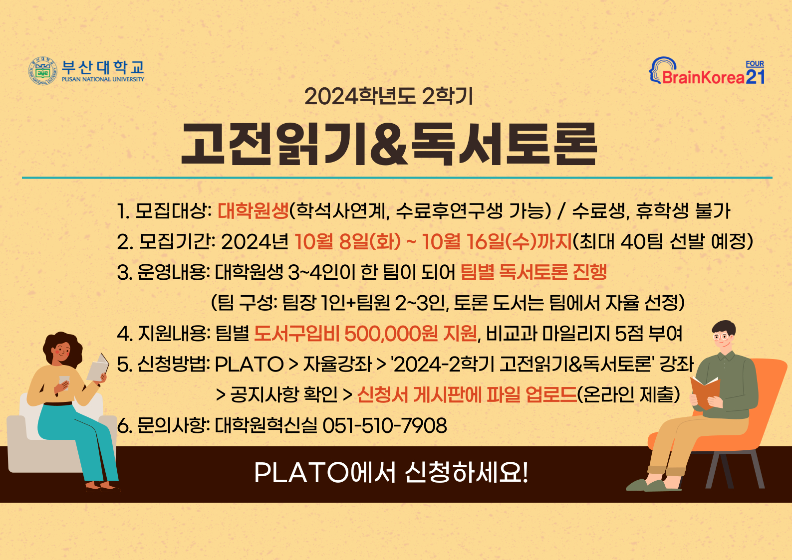 신청방법 | PLATO > 자율강좌 > [2024-2학기 대학원생 고전읽기&독서토론] 강좌 입장 > 공지사항 확인 제출서류: [서식 1, 2, 4, 5]와 팀 전원 재학증명서(또는 수료후연구생등록증) 제출 PLATO의 ‘신청서 제출’ 게시판에 ‘비밀글’로 신청서류 업로드(대면제출 없음) PLATO 바로가기: https://plato.pusan.ac.kr/course/view.php?id=164611 |