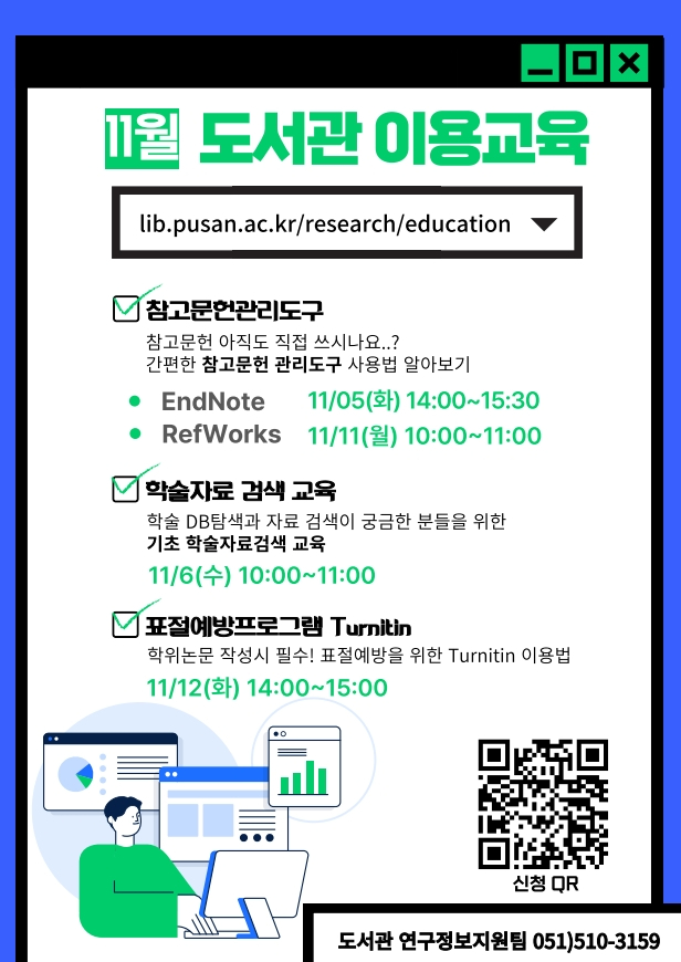 다. 신청경로: [부산대학교 도서관 홈페이지]-[연구·학습지원]-[이용교육]